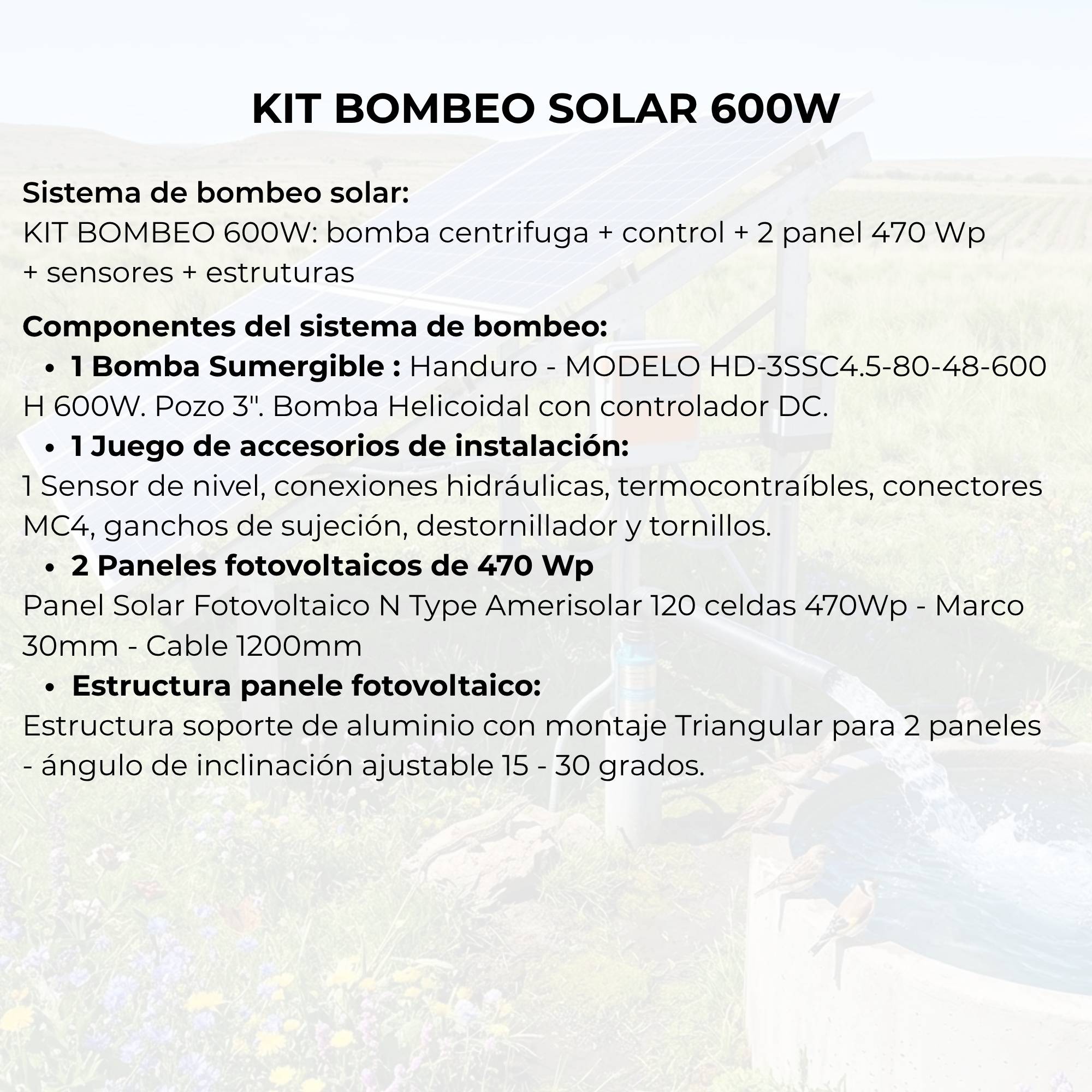 El sistema de bombeo solar autónomo permite la extracción de agua u otros líquidos desde distintas profundidades, impulsándolos hacia depósitos de almacenamiento de forma eficiente y sustentable.