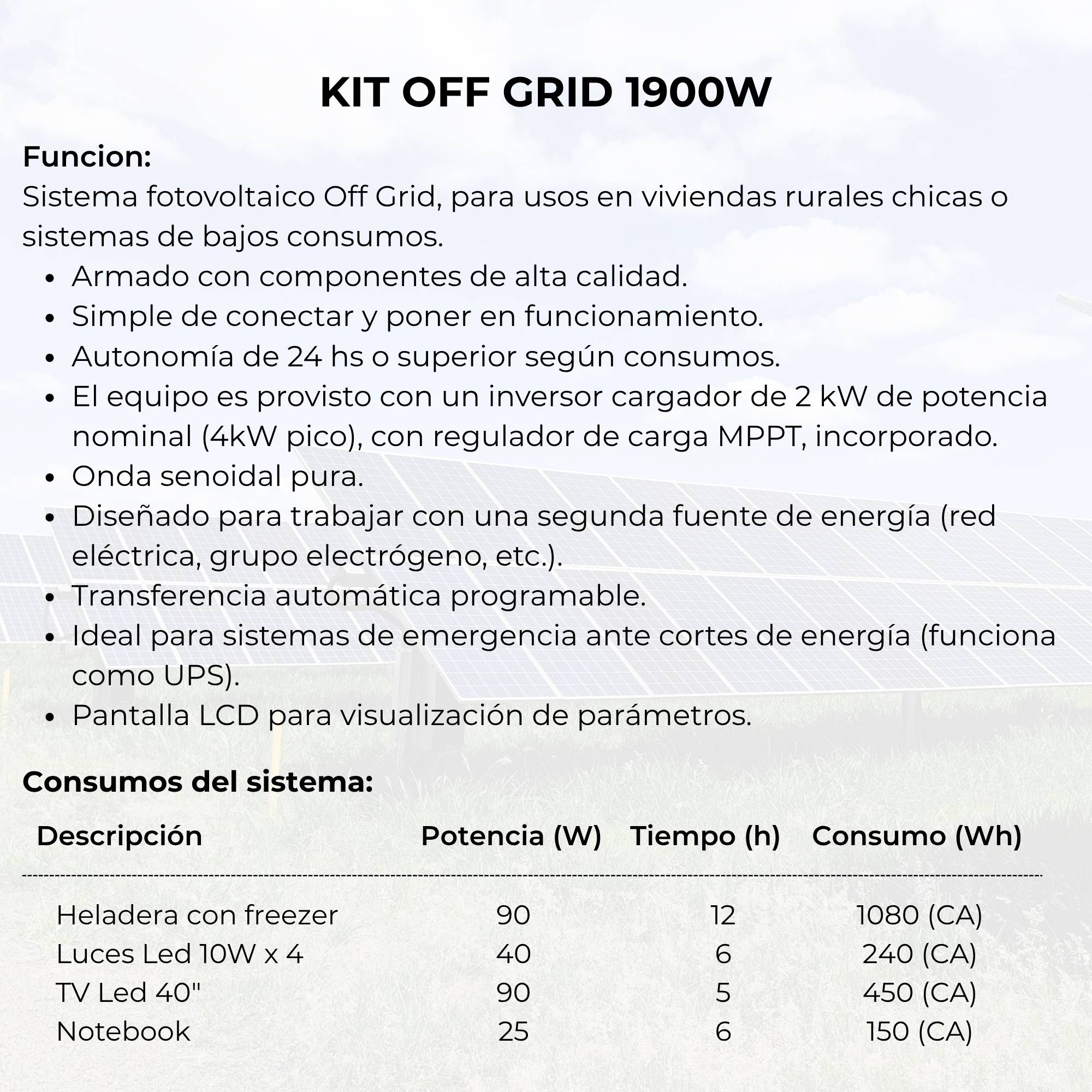 Un sistema Off Grid aislado es una solución completamente independiente de la red. Está compuesto por paneles solares, regulador de carga, inversor y baterías, lo que permite generar, almacenar y utilizar energía en lugares sin acceso al suministro eléctrico.