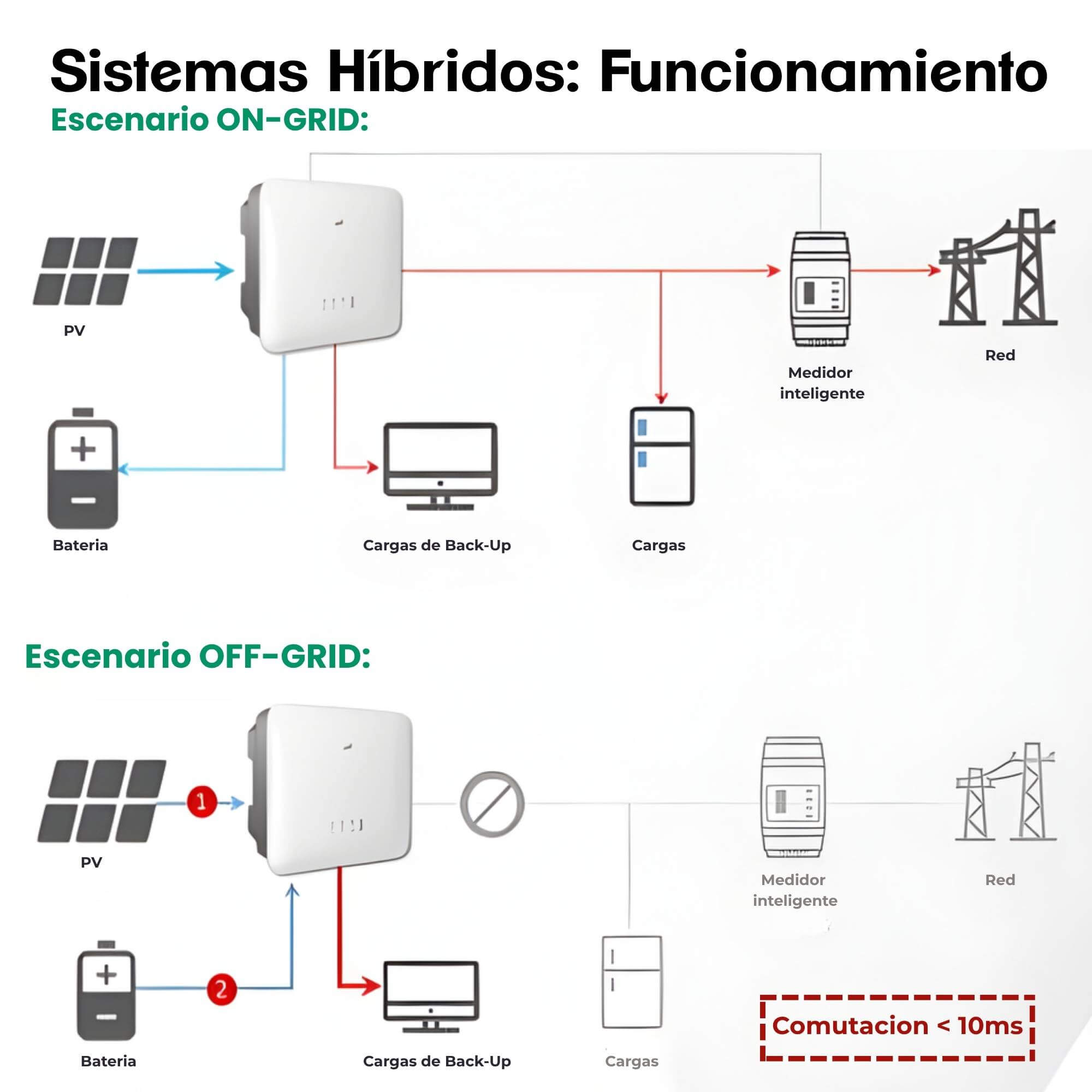• Respaldo ante cortes (UPS/Backup): Si se corta la luz de la calle, el sistema híbrido sigue funcionando. Tus luces, heladeras y Wifi permanecen encendidos usando las baterías.