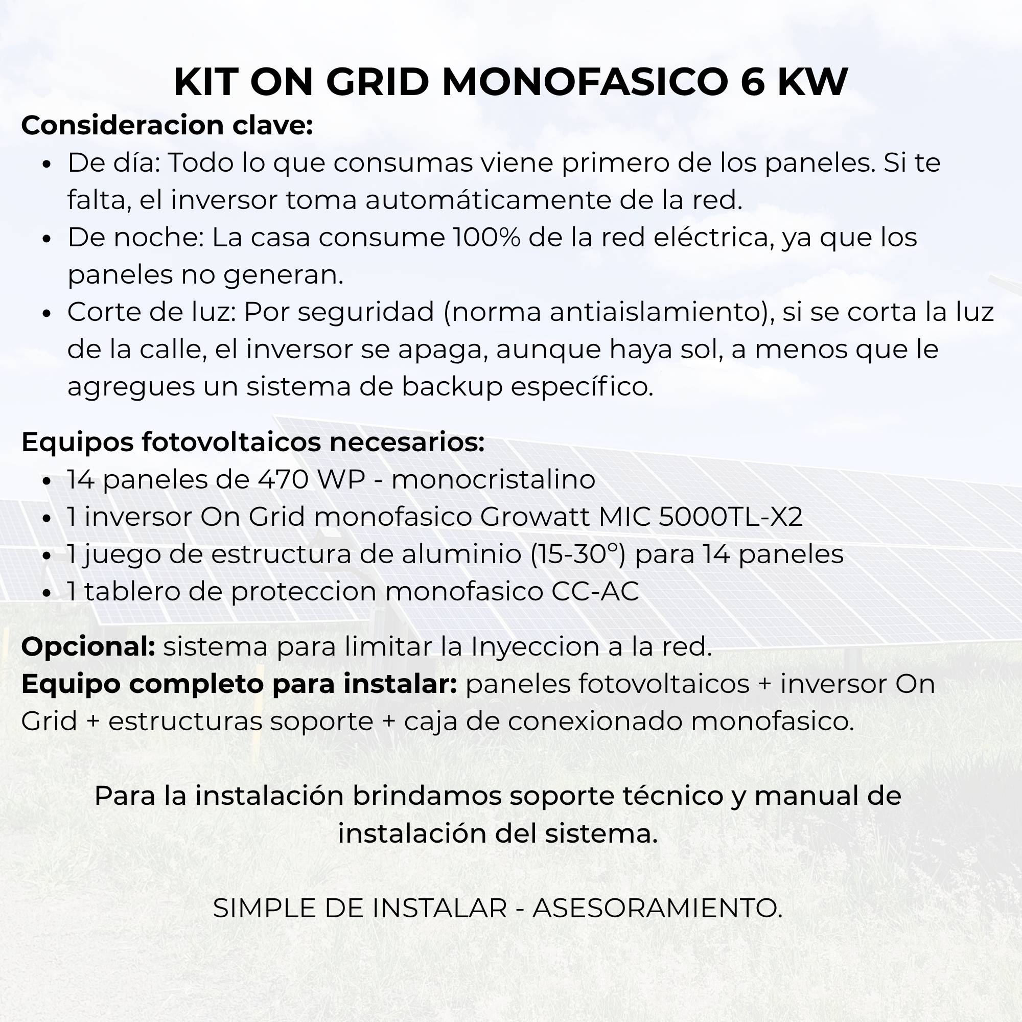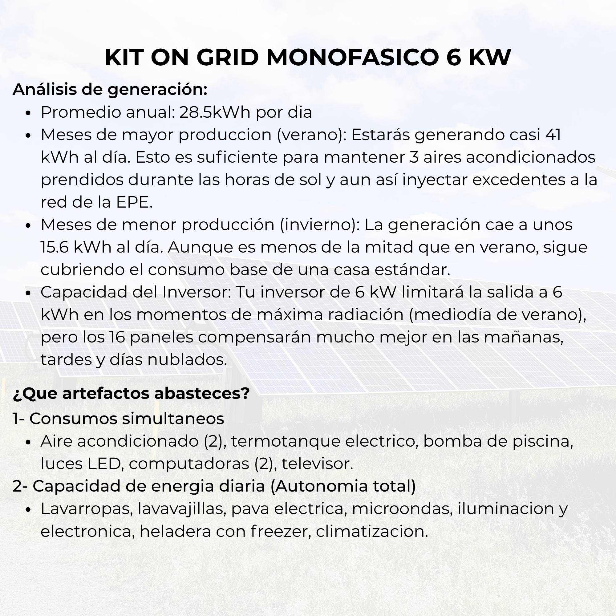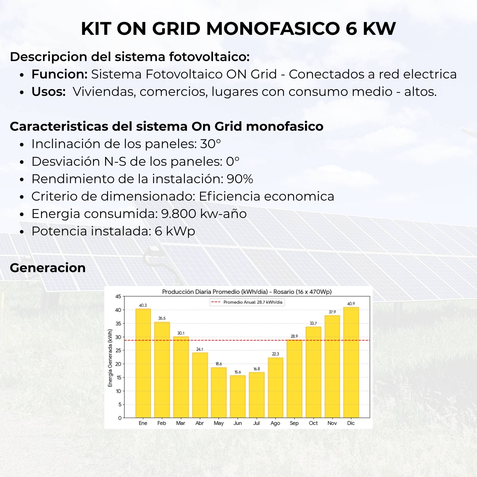 Un sistema On-Grid, conectado a la red eléctrica, genera energía solar para consumo propio, utilizando la red eléctrica convencional como respaldo sin necesidad de baterías. Durante el día, los paneles generan la energía para alimentar el consumo del hogar y en caso de tener excedente de energía, se inyecta a la red eléctrica, obteniendo el beneficio correspondiente, según la empresa prestataria del servicio eléctrico. Por la noche, se toma energía de la red.